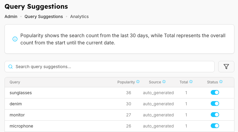 | Filter by source | Analytics (toggle) | Auto-generated suggestions created automatically from user search analytics data |