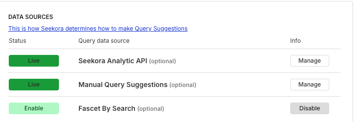 Each source can be enabled/disabled independently. Click "Manage" to configure individual suggestions within each source.