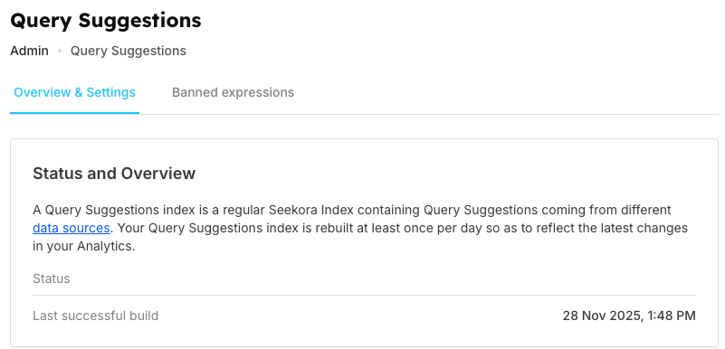 Displays the Query Suggestions index status and last successful build timestamp. The index is automatically rebuilt at least once per day to reflect the latest changes in your analytics and catalog. Monitor related performance in Stats.