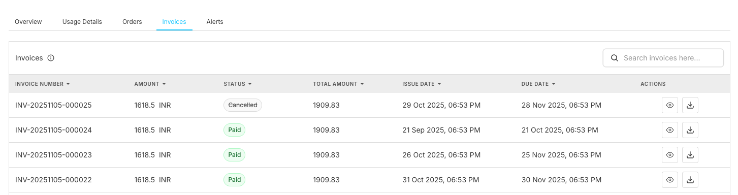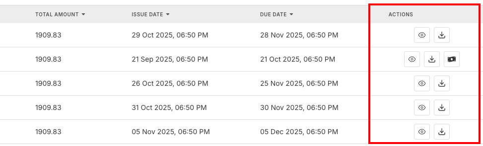 | Actions | Available operations for each invoice (View, Download) | Invoice management functions |