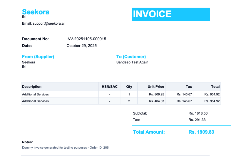 The Invoices provides complete access to your billing documents, payment receipts, and financial records. This section enables you to view, download, and manage all invoices generated for your Seekora account, ensuring proper financial documentation and compliance with accounting requirements.