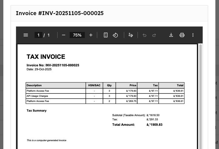 | Platform Access Fee | Detailed charges for platform usage with tax calculations |