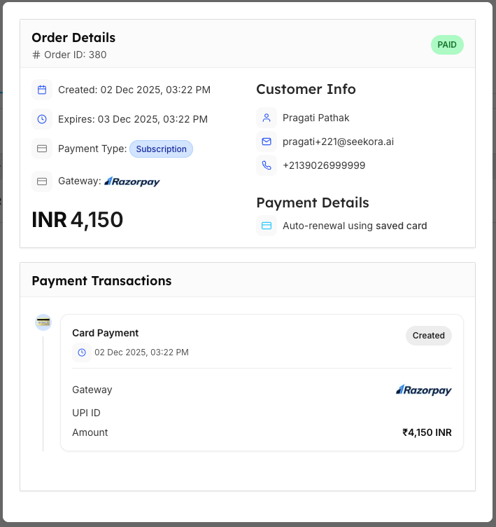 | Sample Value | 380 | 4150 INR | Paid | Subscription | Razorpay | View, Download, Refund |