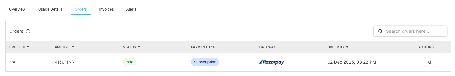 | Field | Order ID | Amount | Status | Payment Type | Gateway | Actions |