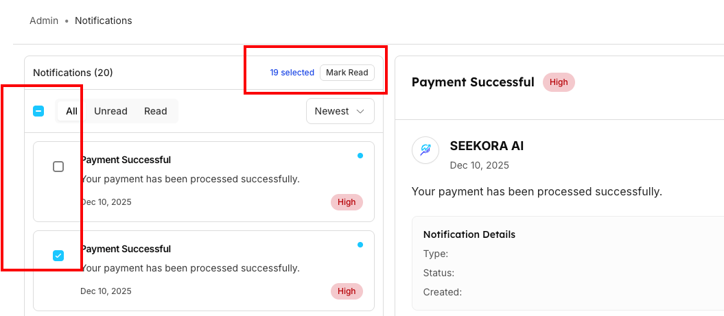 | Functionality | Click checkbox next to notifications to select multiple items for batch operations | Mark multiple selected notifications as read simultaneously | Perform actions on multiple notifications at once for efficient management |