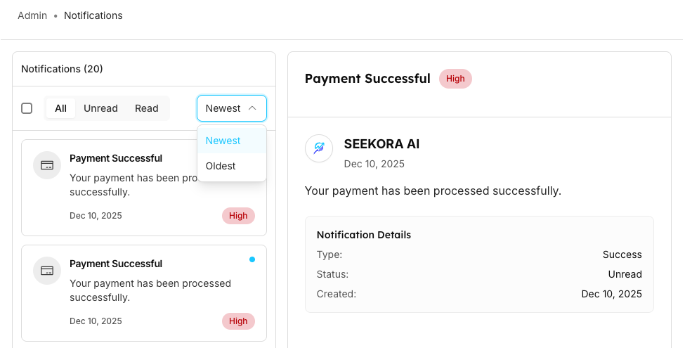 | Filter Panel | Status Filters: | Filter and organize notifications based on read status and chronological order for better management |
