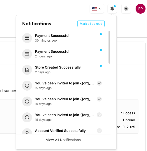 The Notifications system keeps users informed about important events, updates, and activities within the Seekora platform. The notification system provides real-time alerts for various actions like payment confirmations, store creation, account verification, team invitations, and other system events. Users can easily manage, view, and organize their notifications through an intuitive interface.