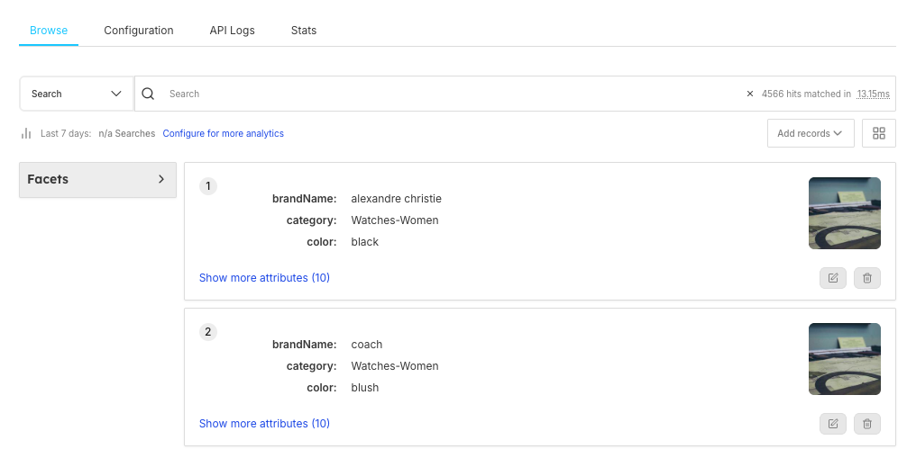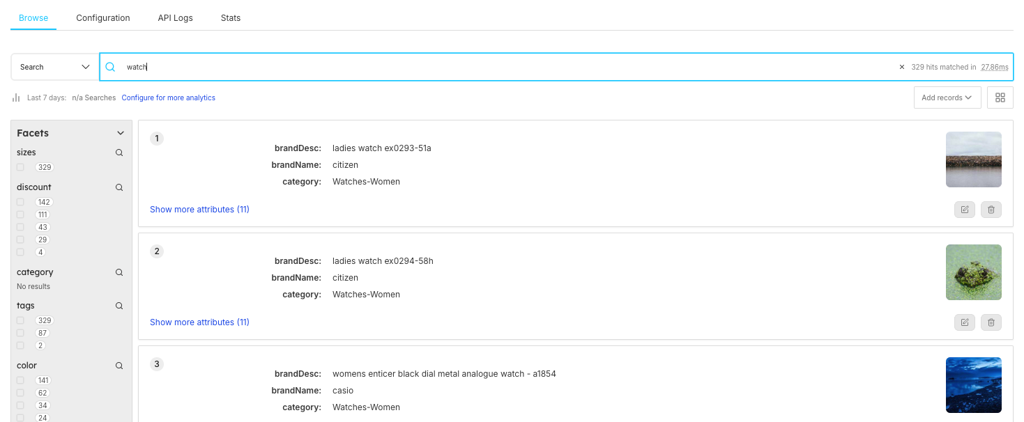 If you want to see how "watches" are being searched and what results appear, you can use Browse to test the search, check facets like brand and category, and ensure the right products are showing up. You can also track search performance in Analytics.
