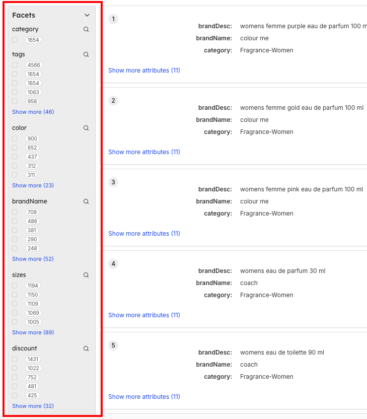 See available filter options for each facet category to understand filtering possibilities