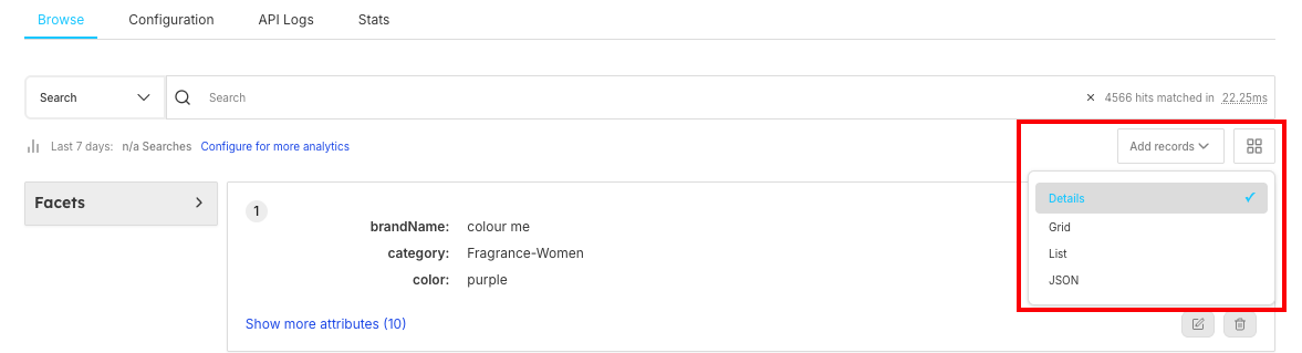 The Browse section is the main search and product discovery interface within the Store management system. It allows administrators to search through the product catalog, view detailed product information, and analyze search results in different formats. This powerful tool helps you understand how products are being indexed, searched, and displayed to end users. You can monitor performance through Analytics and track API calls via API Logs.