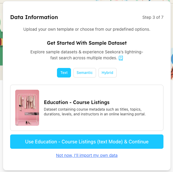- Purpose: Use your own data to experience Seekora's lightning-fast, multi-mode search