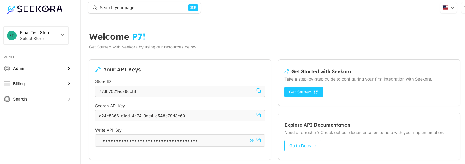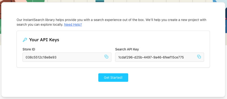 | Search API Key | Read-only access for performing searches and retrieving results. See Next Steps for integration guidance. | Frontend integration and search queries |