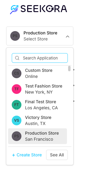 The Store Operations system in Seekora allows users to create, manage, and switch between multiple stores from a centralized interface. The store dropdown in the left sidebar provides quick access to all your stores and store management functions. This system enables seamless multi-store operations, allowing users to manage different business locations, brands, or product catalogs independently while maintaining centralized control. You can monitor operations through Analytics and track API usage via API Logs.